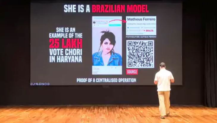 राहुल गांधी ने अपनी प्रेस कॉन्फ्रेंस में आरोप लगाया था कि हरियाणा विधानसभा चुनाव 2024 में 25 लाख वोट चोरी हुए हैं। उन्होंने नीली डेनिम जैकेट पहने एक लड़की की तस्वीर दिखाकर कहा था कि हरियाणा की वोटर लिस्ट में ब्राजीलियन मॉडल का नाम कैसे आया। राहुल के अनुसार, उस मॉडल की तस्वीर का इस्तेमाल 22 अलग-अलग वोटर आईडी पर किया गया, जिनमें उसे कभी सीमा, स्वीटी या सरस्वती के नाम से दिखाया गया। हालांकि राहुल ने मॉडल का नाम नहीं बताया था। बाद में यह पता चला कि यह तस्वीर अनस्प्लैश और पेक्सेल्स जैसी स्टॉक वेबसाइट्स पर 2017 से मौजूद है और इसे चार लाख से अधिक बार डाउनलोड किया जा चुका है। इन वेबसाइटों पर फोटो का क्रेडिट ब्राजील के बेलो होरिजोंटे शहर के फोटोग्राफर मैथ्यूस फरेरो को दिया गया है।